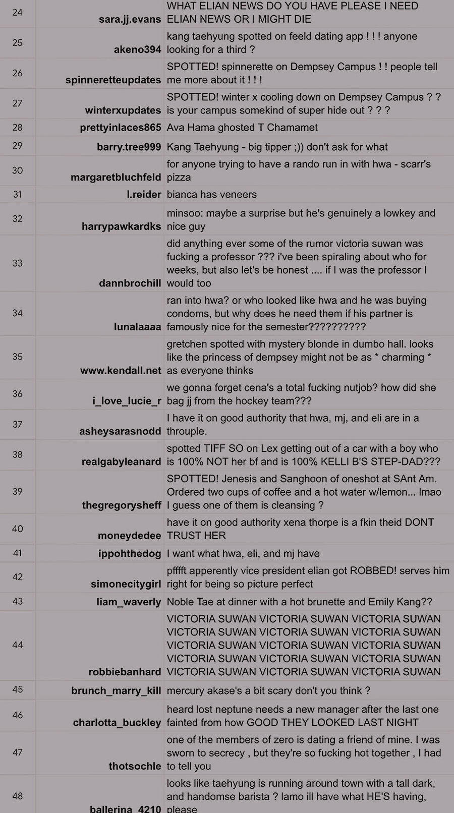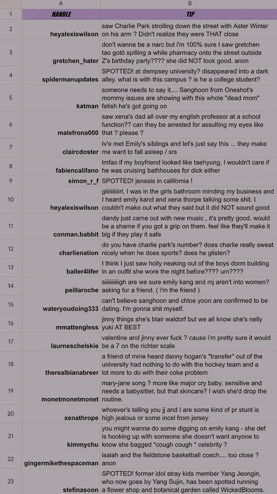Hello followers. Gossip Girl here. Your one and only source for the truth behind the scandalous lies of Dempsey's elite. Been a minute. Did you miss me? I know I've missed you.Gossip Girl runs a blog documenting the lives of Dempsey University's Elite. Posted on the blog are gossip, a "Spotted" map to keep track of frequently mentioned people, photos, and party invitations. Like most major gossip sites, Gossip Girl relies on tips sent in by people who have any information to give.Gossip Girl here, your one and only source into the scandalous lives of Dempsey's elite... And who am I? That's one secret I'll never tell. You know you love me. XOXO, Gossip Girl.